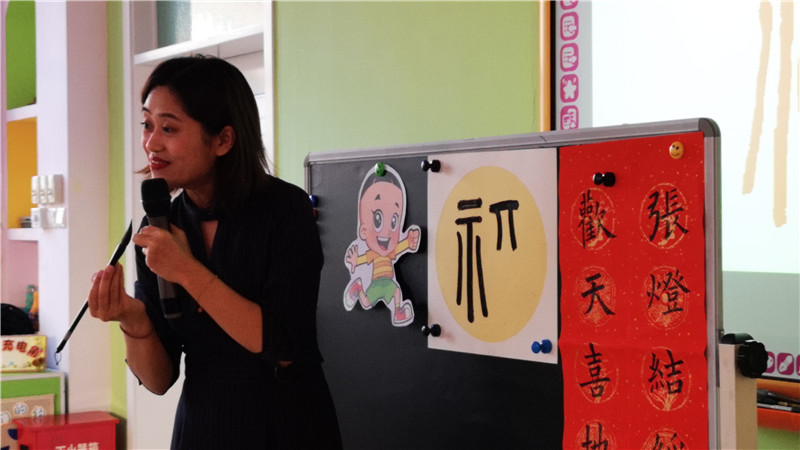 讲解结束后郭老师现场指导小朋友们进行书写,小朋友们各自提笔练习,大家专注地书写着福字,不仅是小朋友,我们的老师也迫不及待的加入其中,认真地品味着汉字的艺术魅力。